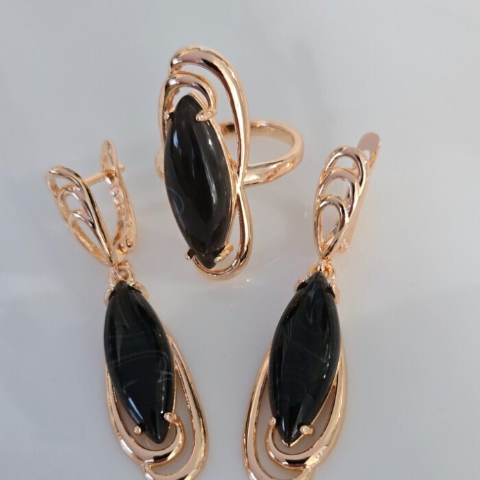 Комплект ювелирной бижутерии коллекция "Дубай" серьги и кольцо 17 р, покрытие позолота, вставка: искусственный камень черного цвета, арт.314.796-17