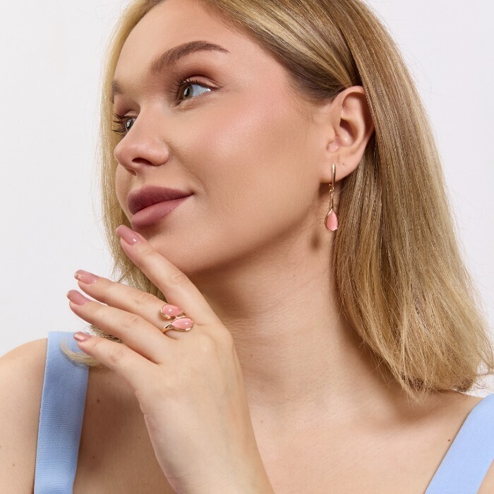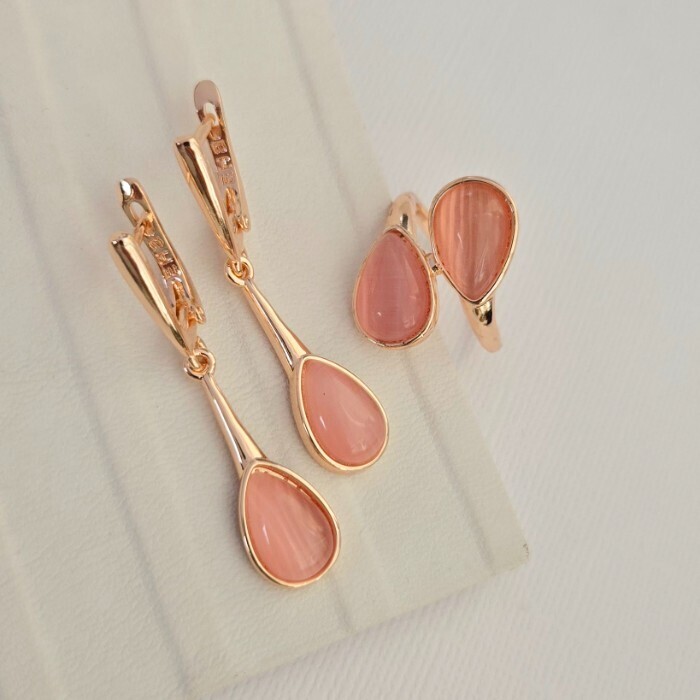 Комплект ювелирной бижутерии коллекция "Дубай" серьги и кольцо 17 р, покрытие позолота, вставка: искусственный кошачий глаз, цвет: розовый, арт.314.984-17