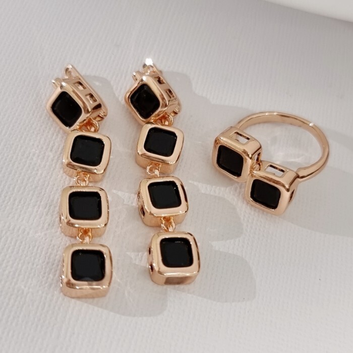 Комплект ювелирной бижутерии коллекция "Дубай" серьги и кольцо 17 р, покрытие позолота, вставка: стекло, цвет: черный, арт.313.493-17