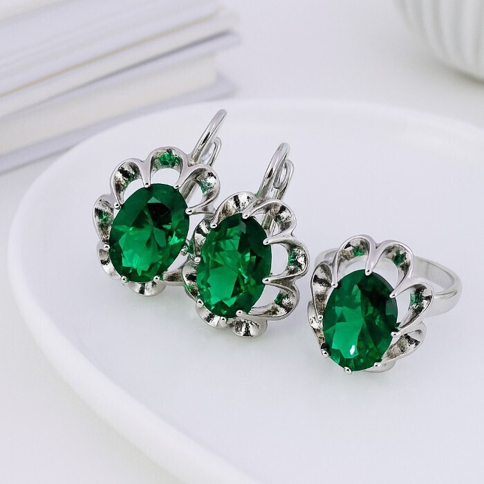 Комплект ювелирной бижутерии коллекция "Дубай" серьги и кольцо 18 р, покрытие посеребрение, вставка: фианит, цвет: зеленый, арт.313.388-18