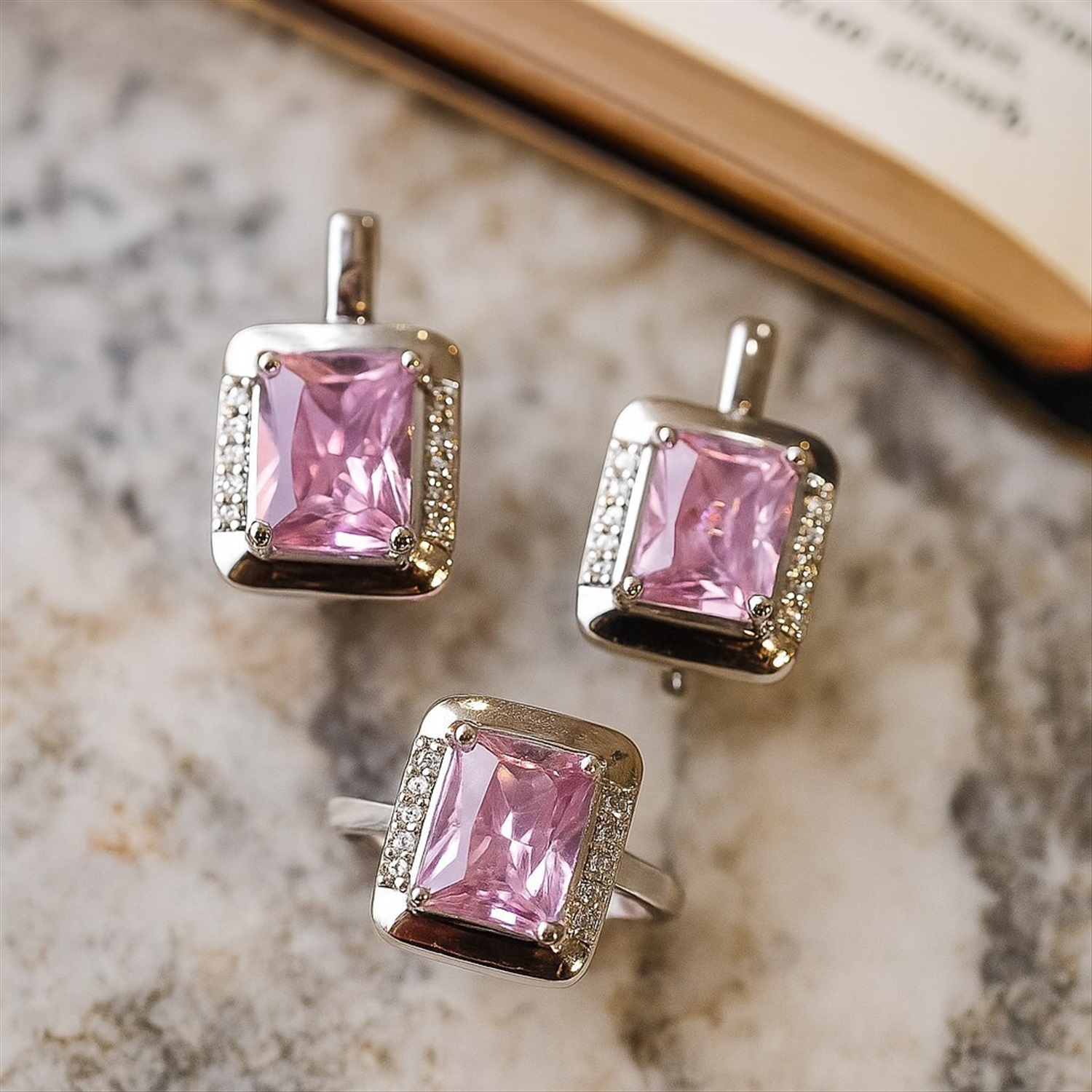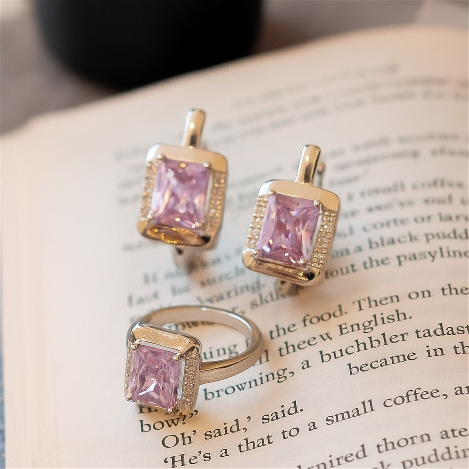 Комплект ювелирной бижутерии коллекция "Дубай" серьги и кольцо 18 р, покрытие посеребрение, вставка: фианиты и цирконы, цвет: розовый и прозрачный, арт.007.145-18