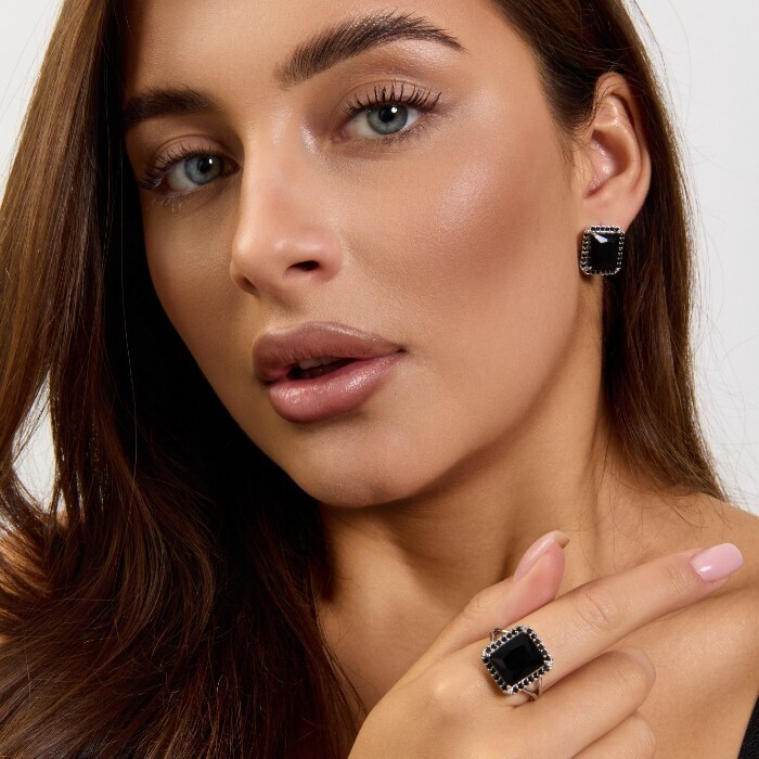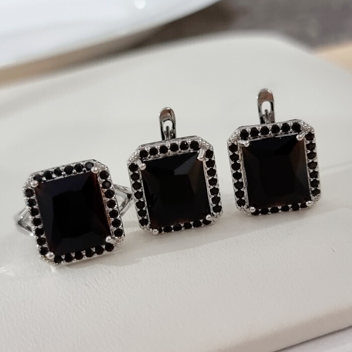 Комплект ювелирной бижутерии коллекция "Дубай" серьги и кольцо 18 р покрытие посеребрение, вставка: стекло и цирконы, цвет: черный, арт.215.546-18