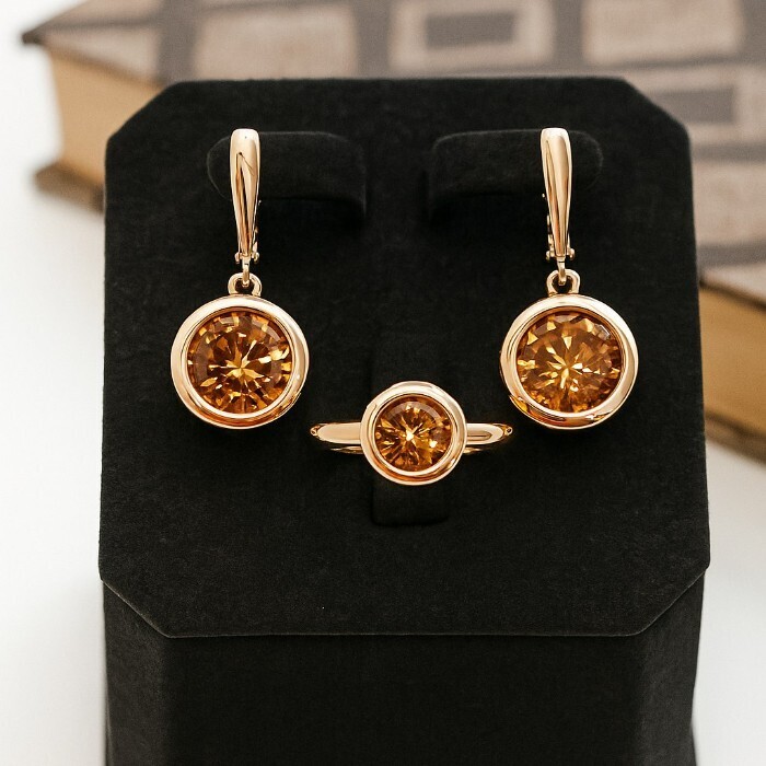 Комплект ювелирной бижутерии коллекция "Дубай" серьги и кольцо 18 р, покрытие позолота, вставка: фианит, цвет: шампань, арт.313.335-18