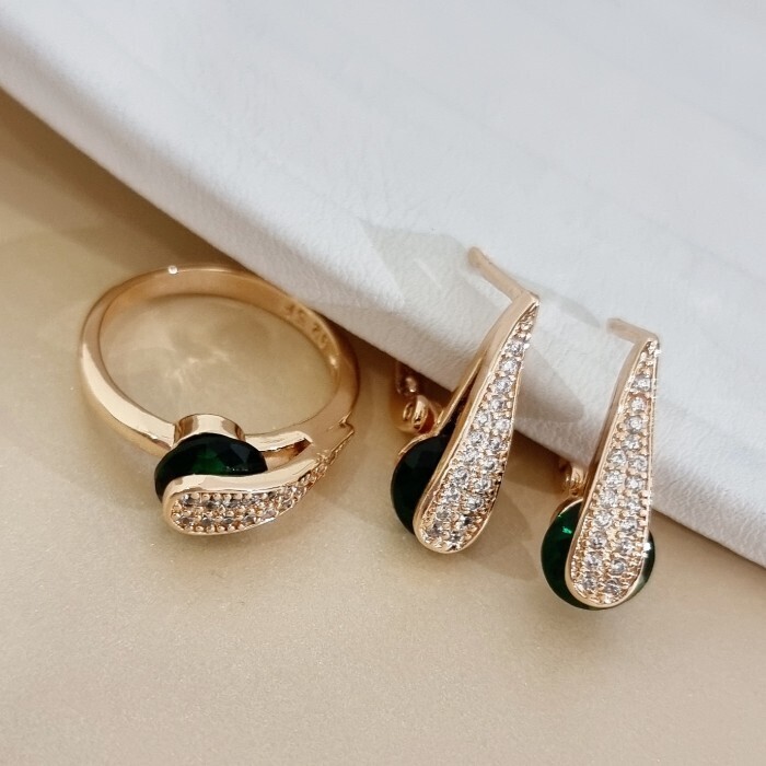 Комплект ювелирной бижутерии коллекция "Дубай" серьги и кольцо 18 р, покрытие позолота, вставка: фианит и цирконы, цвет: прозрачный и зеленый, арт.313.504-18