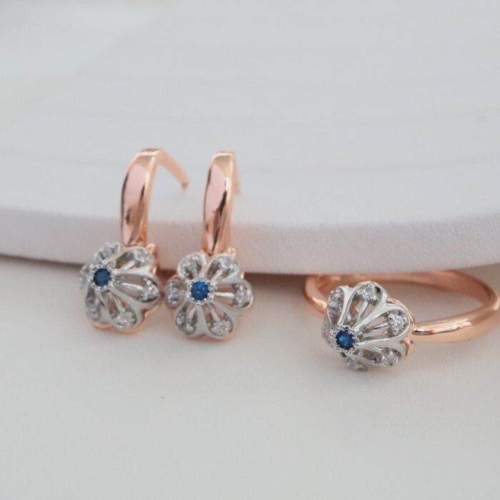 Комплект ювелирной бижутерии коллекция "Дубай" серьги и кольцо 18 р, покрытие позолота, вставка: фианиты, цвет: синий, арт.213.971-18