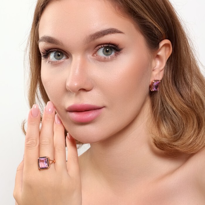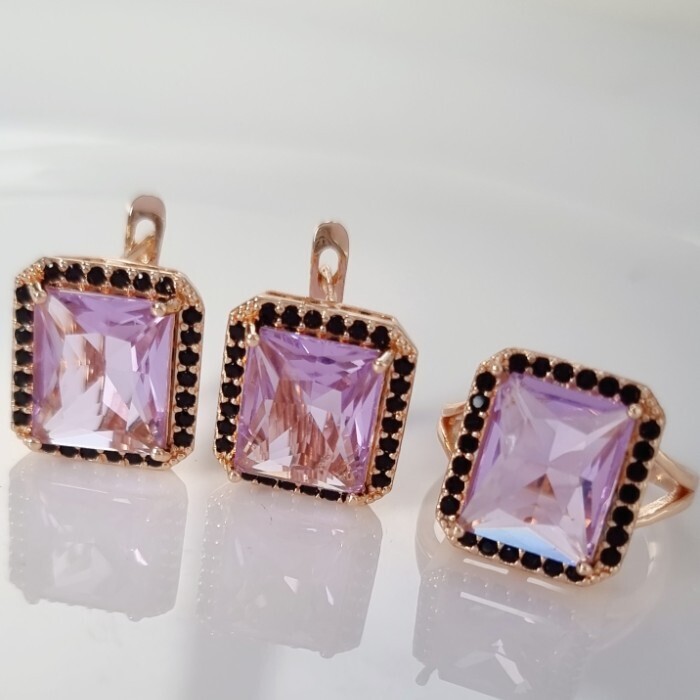 Комплект ювелирной бижутерии коллекция "Дубай" серьги и кольцо 18 р, покрытие позолота, вставка: фианиты, цвет: фиолетовый и черный, арт.215.366-18