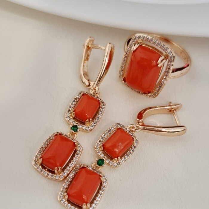 Комплект ювелирной бижутерии коллекция "Дубай" серьги и кольцо 18 р, покрытие позолота, вставка: фианиты и искусственный камень, цвет: оранжевый и прозрачный, арт.313.166-18
