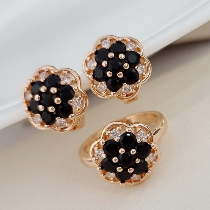 Комплект ювелирной бижутерии коллекция "Дубай" серьги и кольцо 18 р, покрытие позолота, вставка: фианиты, цвет: черный, арт.313.211-18