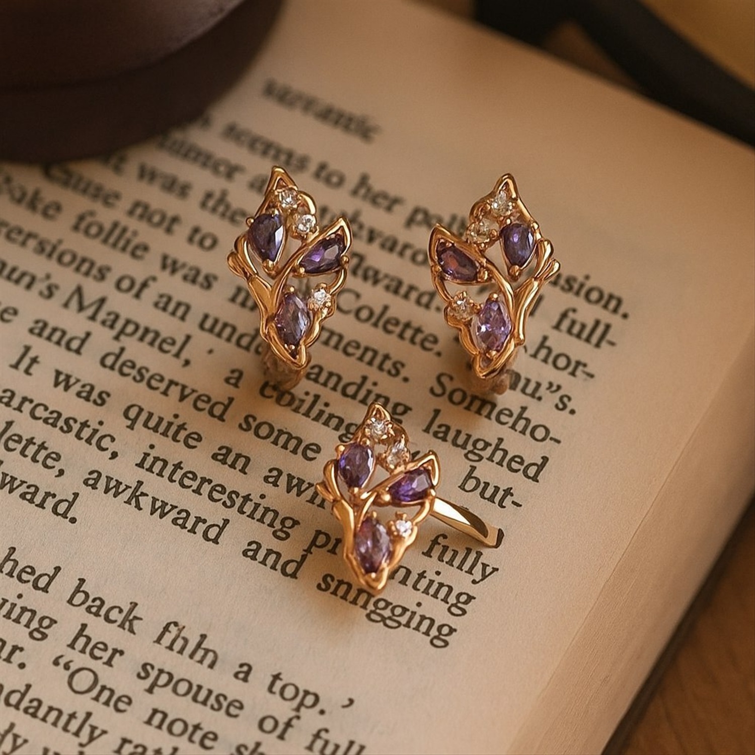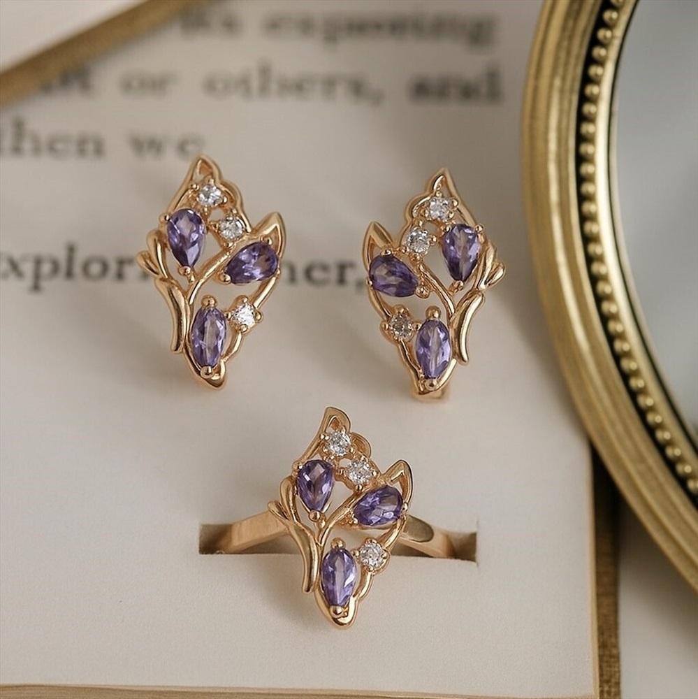 Комплект ювелирной бижутерии коллекция "Дубай" серьги и кольцо 18 р, покрытие позолота, вставка: фианиты, цвет: фиолетовый и прозрачный, арт.007.175-18