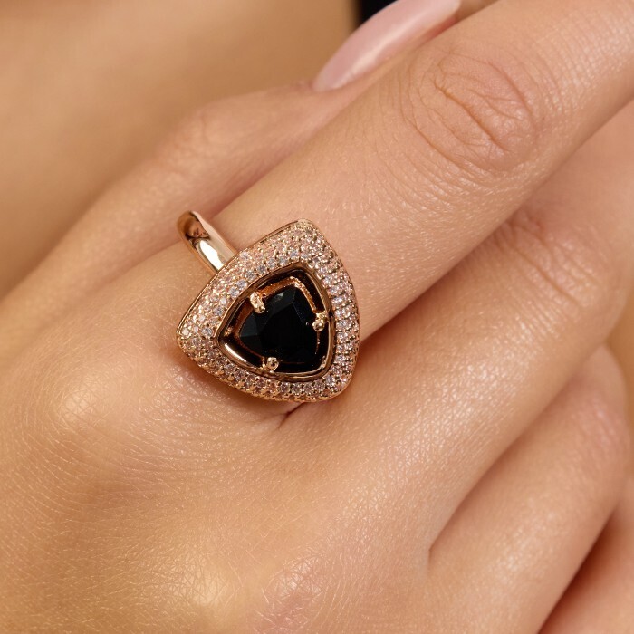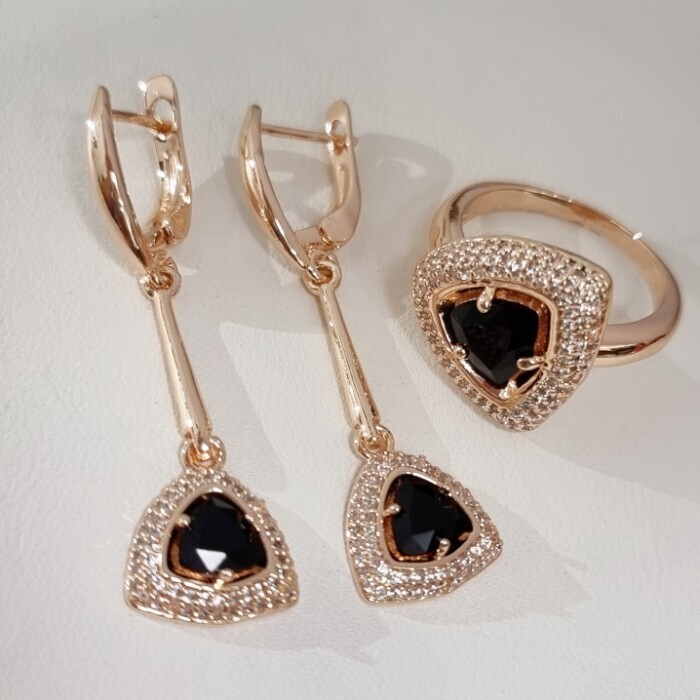 Комплект ювелирной бижутерии коллекция "Дубай" серьги и кольцо 18 р покрытие позолота, вставка: фианиты и цирконы, цвет: черный и прозрачный, арт.215.615-18