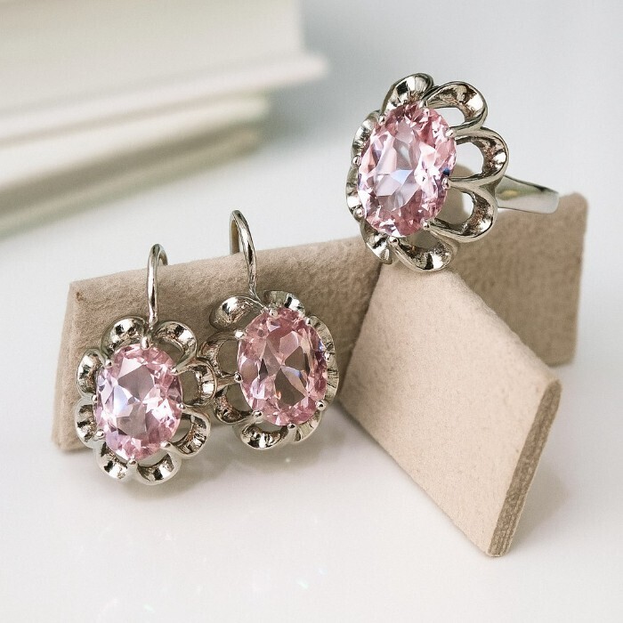 Комплект ювелирной бижутерии коллекция "Дубай" серьги и кольцо 19 р, покрытие посеребрение, вставка: фианит, цвет: розовый, арт.313.390-19