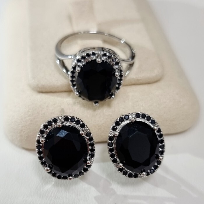 Комплект ювелирной бижутерии коллекция "Дубай" серьги и кольцо 19 р покрытие посеребрение, вставка: стекло и цирконы, цвет: черный, арт.215.611-19