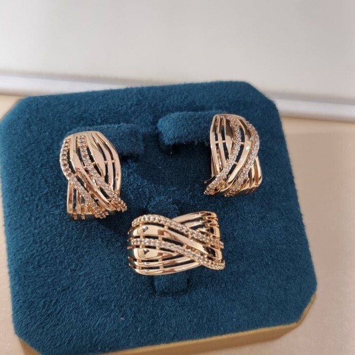 Комплект ювелирной бижутерии коллекция "Дубай" серьги и кольцо 19 р, покрытие позолота, вставка: цирконы, цвет: прозрачный, арт.313.438-19