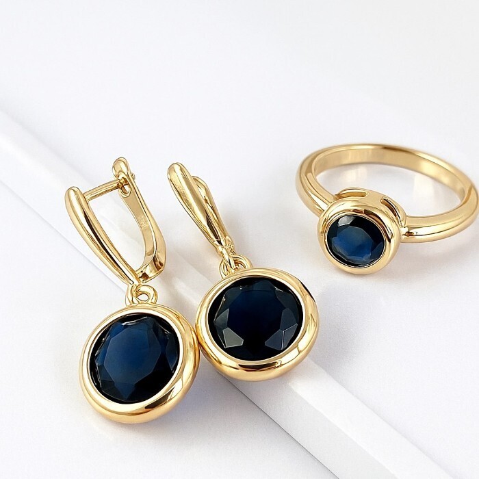 Комплект ювелирной бижутерии коллекция "Дубай" серьги и кольцо 19 р, покрытие позолота, вставка: фианит, цвет: синий, арт.313.336-19