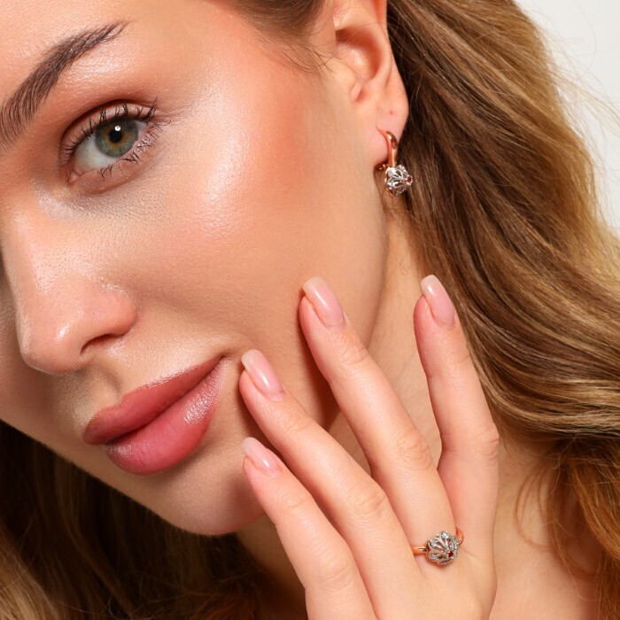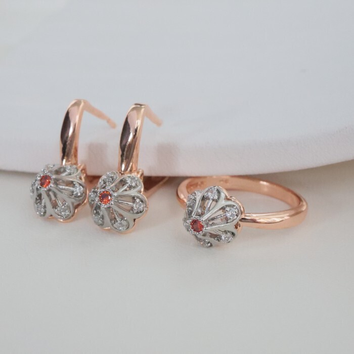 Комплект ювелирной бижутерии коллекция "Дубай" серьги и кольцо 19 р, покрытие позолота, вставка: фианиты, цвет: красный, арт.213.974-19