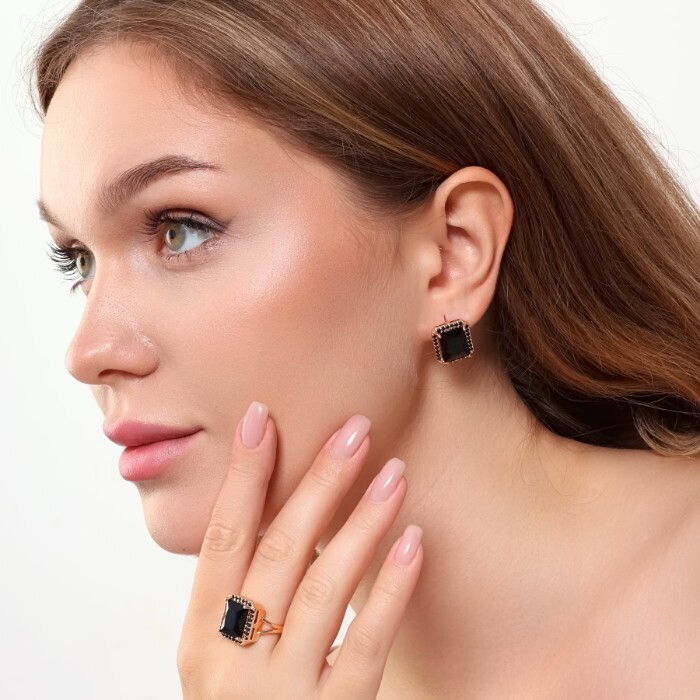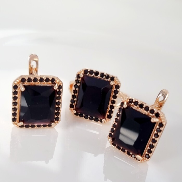 Комплект ювелирной бижутерии коллекция "Дубай" серьги и кольцо 19 р, покрытие позолота, вставка: фианиты, цвет: черный, арт.215.367-19