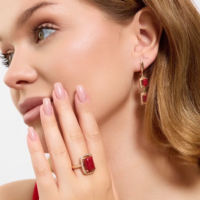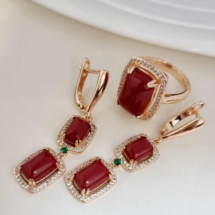 Комплект ювелирной бижутерии коллекция "Дубай" серьги и кольцо 19 р, покрытие позолота, вставка: фианиты и искусственный камень, цвет: бордовый и прозрачный, арт.313.164-19