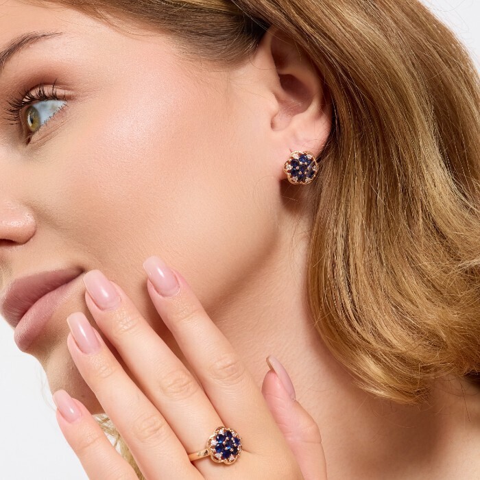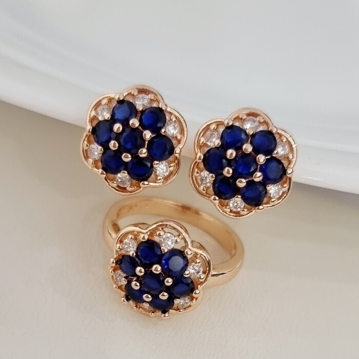 Комплект ювелирной бижутерии коллекция "Дубай" серьги и кольцо 19 р, покрытие позолота, вставка: фианиты, цвет: синий, арт.313.207-19