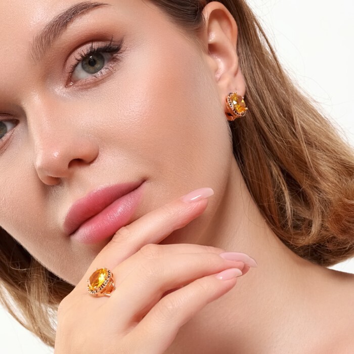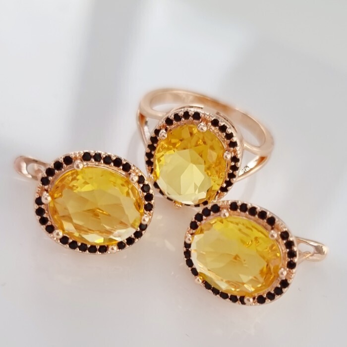 Комплект ювелирной бижутерии коллекция "Дубай" серьги и кольцо 20 р, покрытие позолота, вставка: фианиты, цвет: желтый и черный, арт.215.353-20