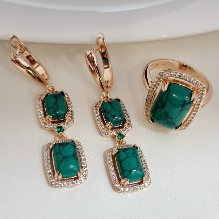 Комплект ювелирной бижутерии коллекция "Дубай" серьги и кольцо 20 р, покрытие позолота, вставка: фианиты и искусственный камень, цвет: изумрудный и прозрачный, арт.313.163-20