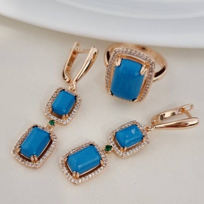 Комплект ювелирной бижутерии коллекция "Дубай" серьги и кольцо 20 р, покрытие позолота, вставка: фианиты и искусственный камень, цвет: бирюзовый и прозрачный, арт.313.165-20