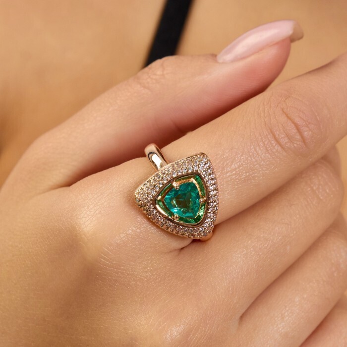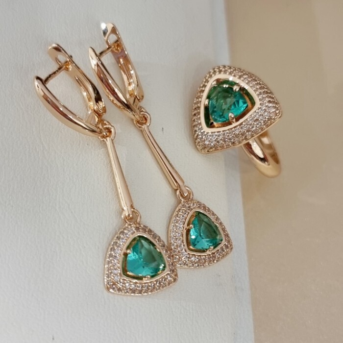 Комплект ювелирной бижутерии коллекция "Дубай" серьги и кольцо 20 р покрытие позолота, вставка: фианиты и цирконы, цвет: морская волна и прозрачный, арт.215.618-20