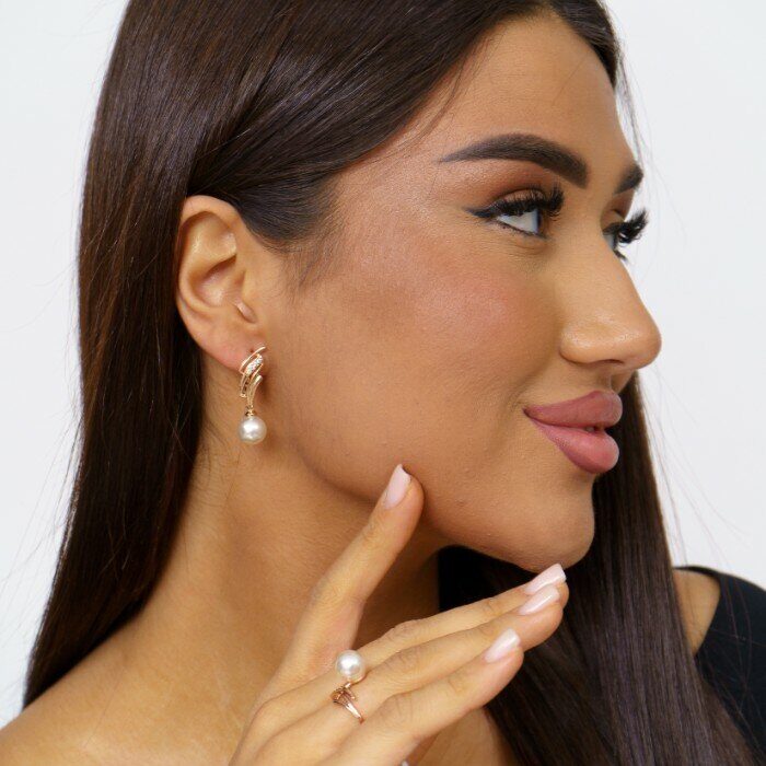 Описание Размер кольца: 17. Размер серёжек: 3,3*1 см. Замок: английский. Материал: бижутерный сплав, фианиты, иск.жемчуг. Вес: 8 гр. Комментарии к товару