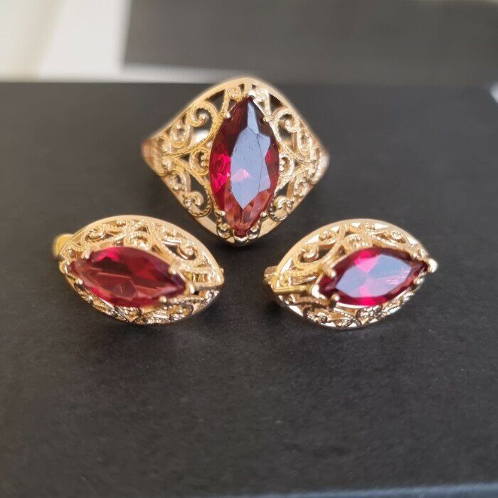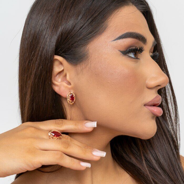 Комплект ювелирной бижутерии коллекция "Дубай" серьги и кольцо, покрытие: позолота, вставка: камень, цвет: красный, р-р 21, 7602, арт.216.361-21