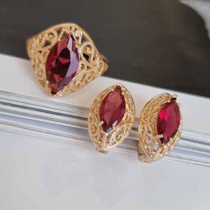 Комплект ювелирной бижутерии коллекция "Дубай" серьги и кольцо, покрытие: позолота, вставка: камень, цвет: красный, р-р 20,5, 7602, арт.216.361-20,5
