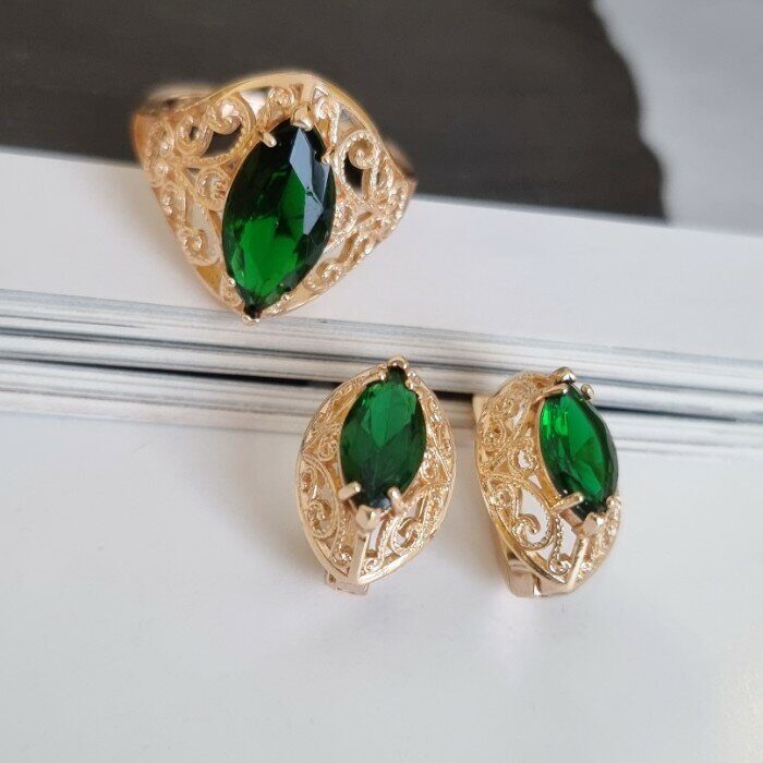 Описание Размер кольца: 21. Размер серёжек: 1,8*1,1 см. Замок: английский. Материал: бижутерный сплав, камни. Вес: 8 гр. Комментарии к товару