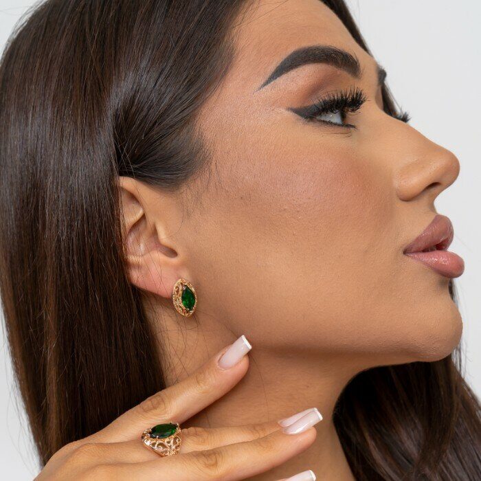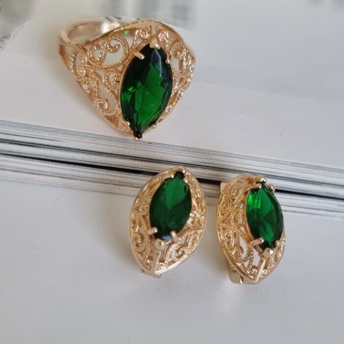 Описание Размер кольца: 18,5. Размер серёжек: 1,8*1,1 см. Замок: английский. Материал: бижутерный сплав, камни. Вес: 8 гр. Комментарии к товару