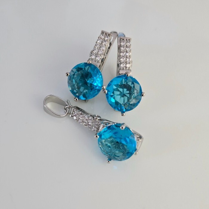 Комплект ювелирной бижутерии коллекция "Дубай" серьги и кулон, покрытие посеребрение, вставка: фианиты и цирконы, цвет: голубой и прозрачный, арт.414.011