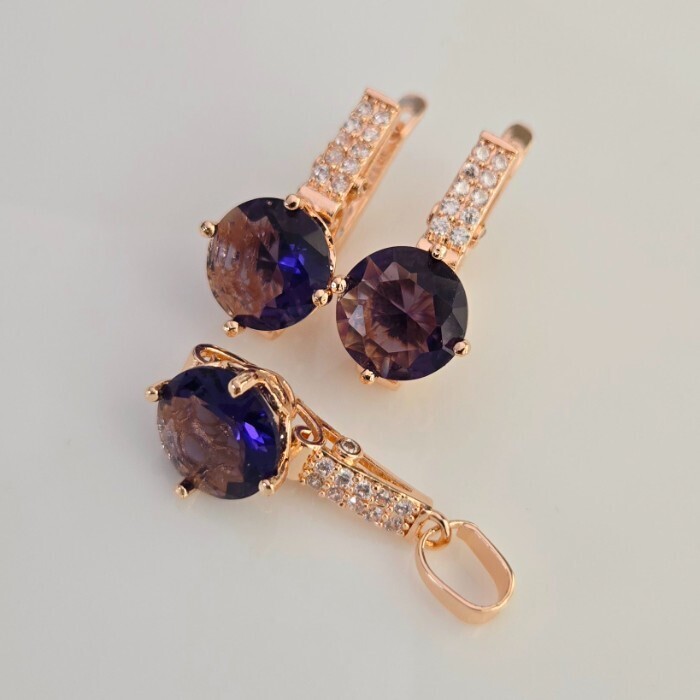Комплект ювелирной бижутерии коллекция "Дубай" серьги и кулон, покрытие позолота, вставка: фианиты и цирконы, цвет: фиолетовый и прозрачный, арт.414.010