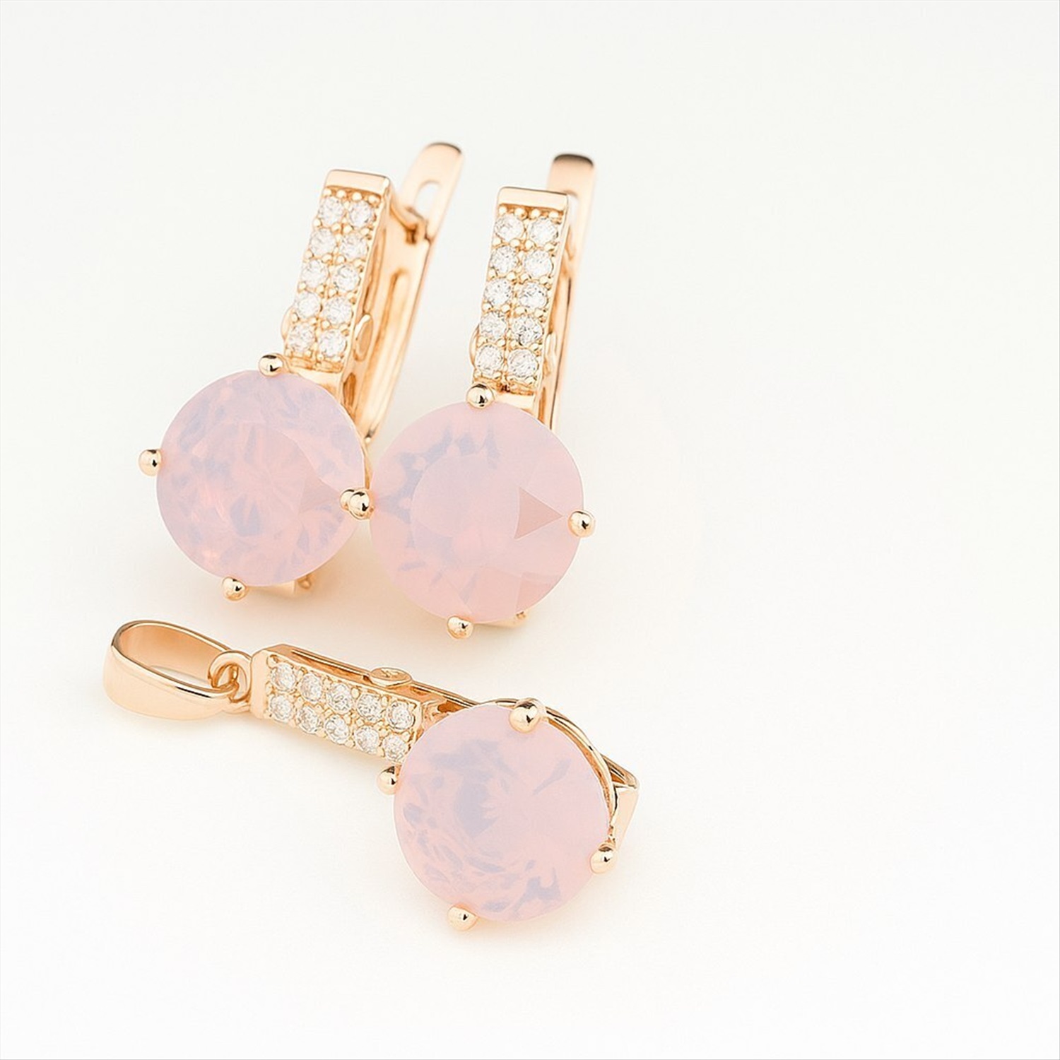Комплект ювелирной бижутерии коллекция "Дубай" серьги и кулон, покрытие позолота, вставка: фианиты и цирконы, цвет: нежно-розовый и прозрачный, арт.414.002