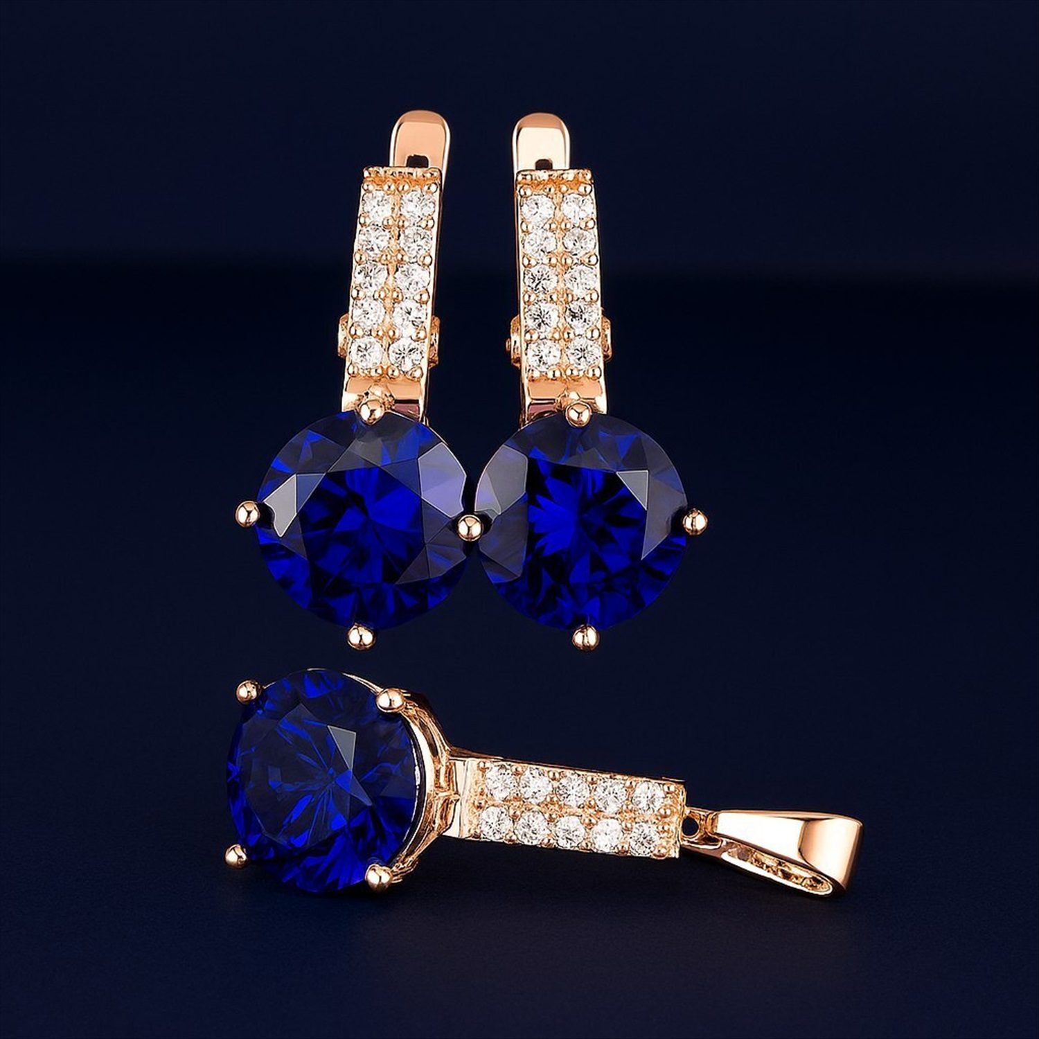 Комплект ювелирной бижутерии коллекция "Дубай" серьги и кулон, покрытие позолота, вставка: фианиты и цирконы, цвет: сапфировый и прозрачный, арт.414.004