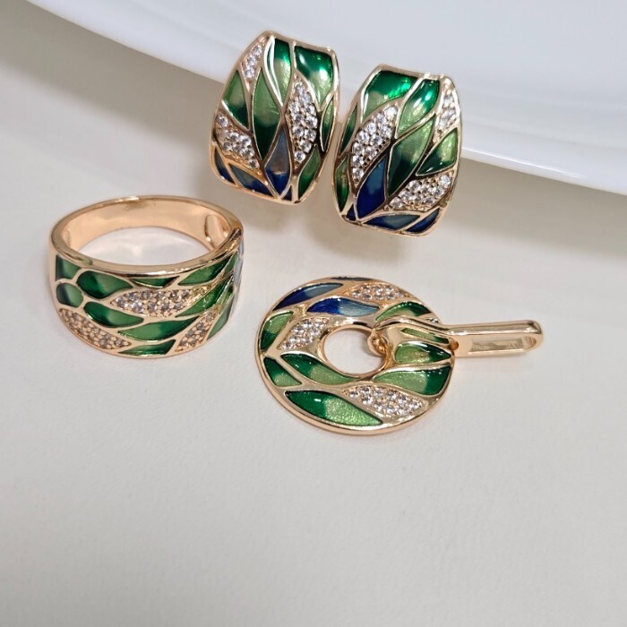 Комплект ювелирной бижутерии коллекция "Дубай" серьги, кулон и кольцо 17 р, покрытие позолота, вставка: эмаль и фианиты, цвет: зеленый, синий и прозрачный, арт.313.270-17