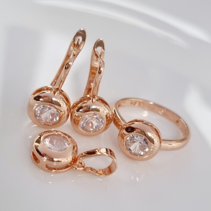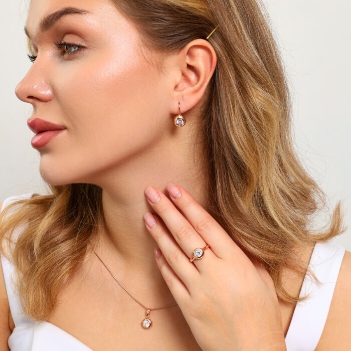 Комплект ювелирной бижутерии коллекция "Дубай" серьги, кулон и кольцо 17 р, покрытие: позолота, вставка: фианиты, цвет: прозрачный, арт.213.908-17