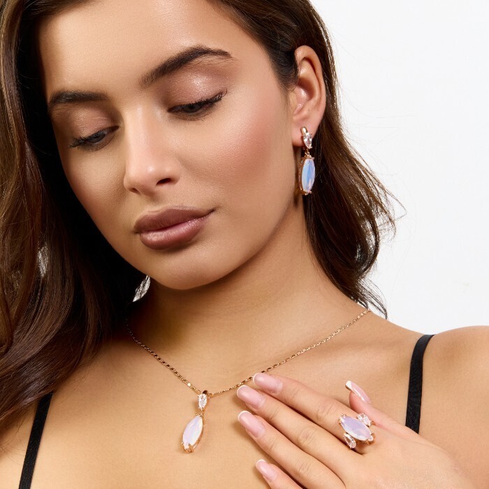 Комплект ювелирной бижутерии коллекция "Дубай" серьги, кулон и кольцо 17 р, покрытие позолота, вставка: стекло и фианиты, цвет: прозрачно-голубой и прозрачный, арт.414.244-17