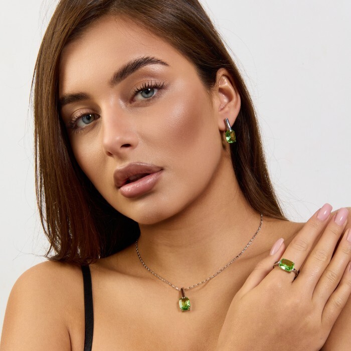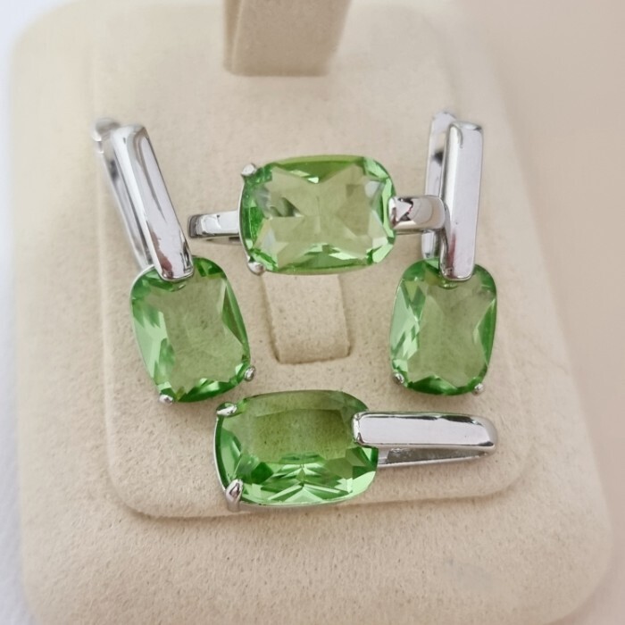Комплект ювелирной бижутерии коллекция "Дубай" серьги, кулон и кольцо 18 р покрытие посеребрение, вставка: стекло, цвет: светло-зеленый, арт.215.537-18
