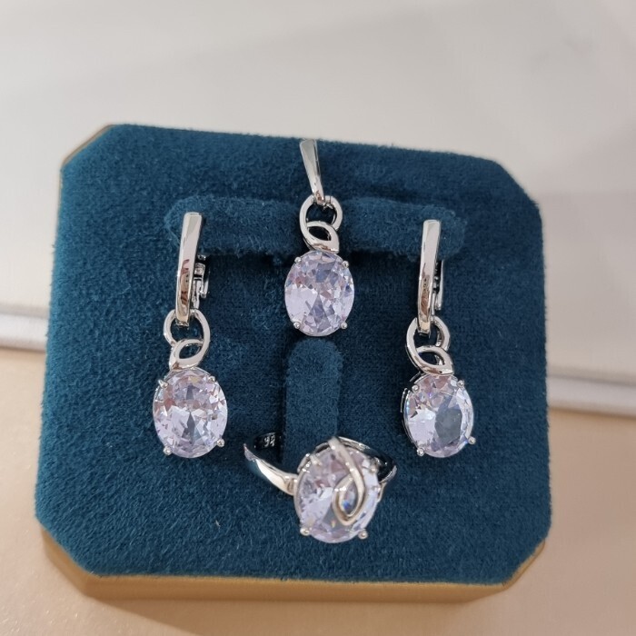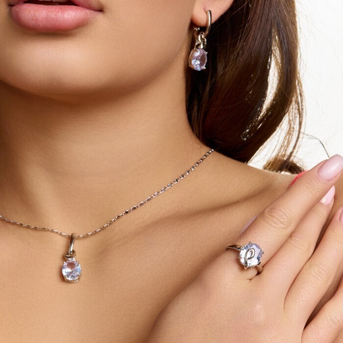 Комплект ювелирной бижутерии коллекция "Дубай" серьги, кулон и кольцо 18 р, покрытие посеребрение, вставка: стекло, цвет: прозрачный, арт.313.446-18
