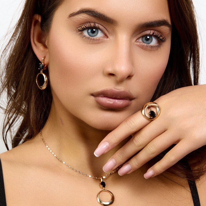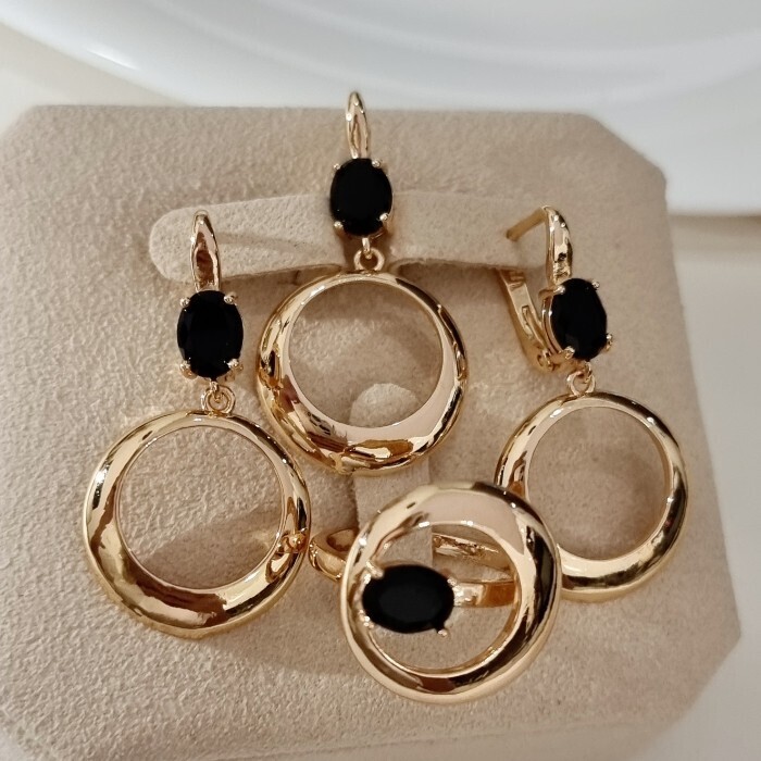 Комплект ювелирной бижутерии коллекция "Дубай" серьги, кулон и кольцо 18 р, покрытие позолота, вставка: фианиты, цвет: черный, арт.217.479-18