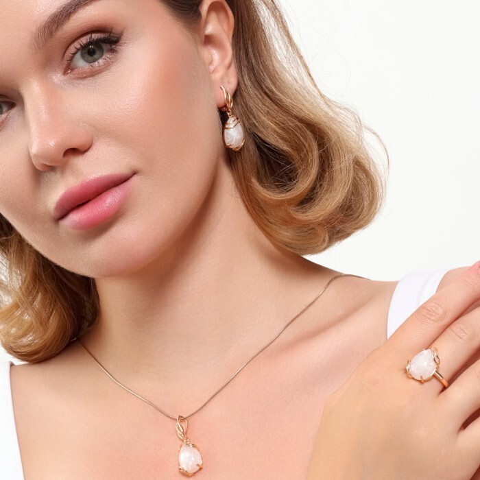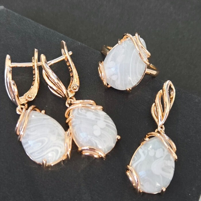 Комплект ювелирной бижутерии коллекция "Дубай" серьги, кулон и кольцо 18 р, покрытие позолота, вставка: искусственный камень молочного цвета, арт.314.799-18