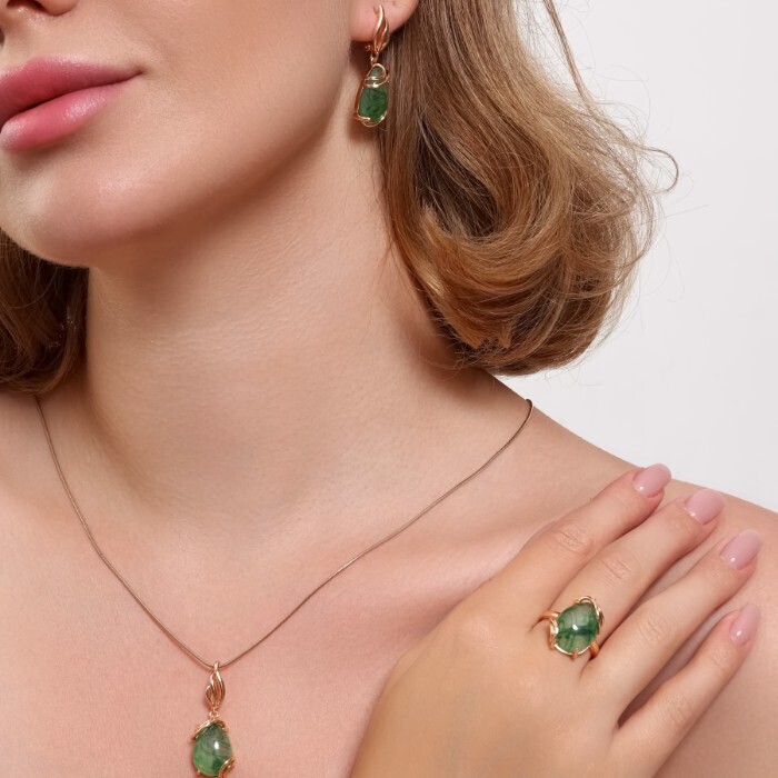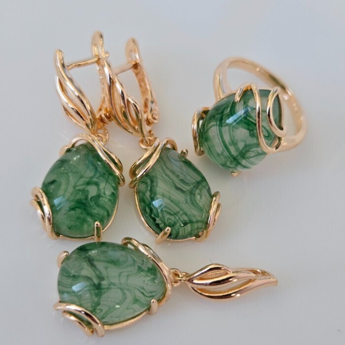 Комплект ювелирной бижутерии коллекция "Дубай" серьги, кулон и кольцо 18 р, покрытие позолота, вставка: искусственный камень зеленого цвета, арт.314.800-18