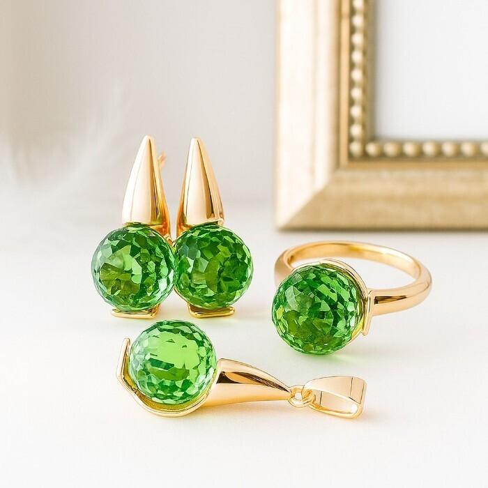 Комплект ювелирной бижутерии коллекция "Дубай" серьги, кулон и кольцо 18 р, покрытие позолота, вставка: кристалл, цвет: зеленый, арт.414.198-18