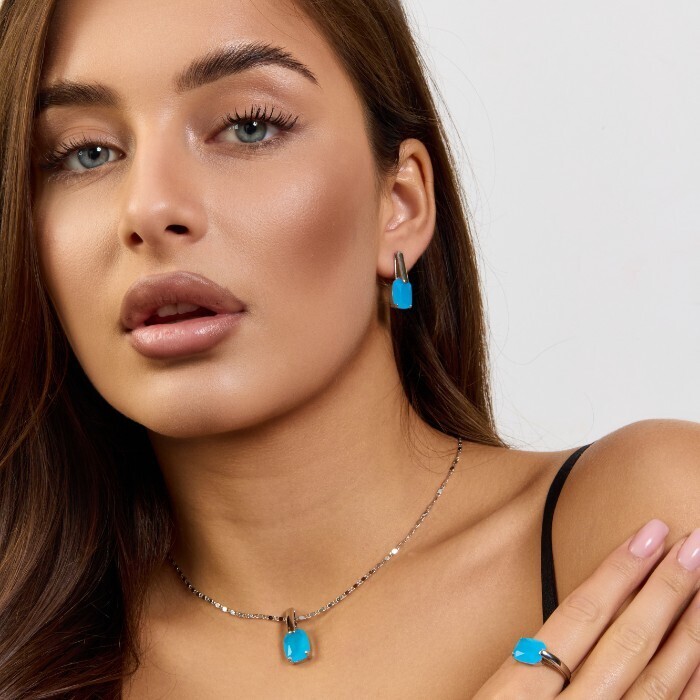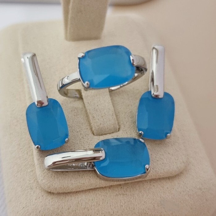 Комплект ювелирной бижутерии коллекция "Дубай" серьги, кулон и кольцо 19 р покрытие посеребрение, вставка: стекло, цвет: бирюзовый матовый, арт.215.531-19