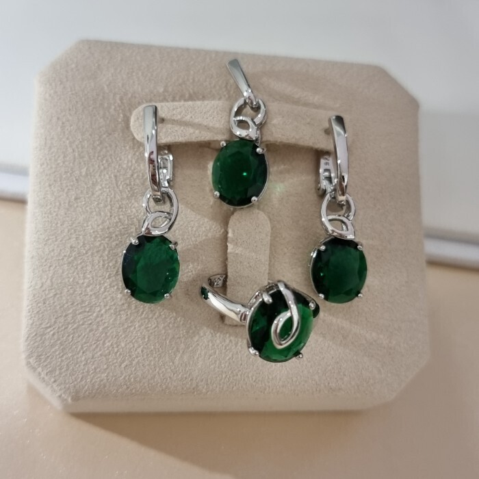 Комплект ювелирной бижутерии коллекция "Дубай" серьги, кулон и кольцо 19 р, покрытие посеребрение, вставка: стекло, цвет: зеленый, арт.313.445-19