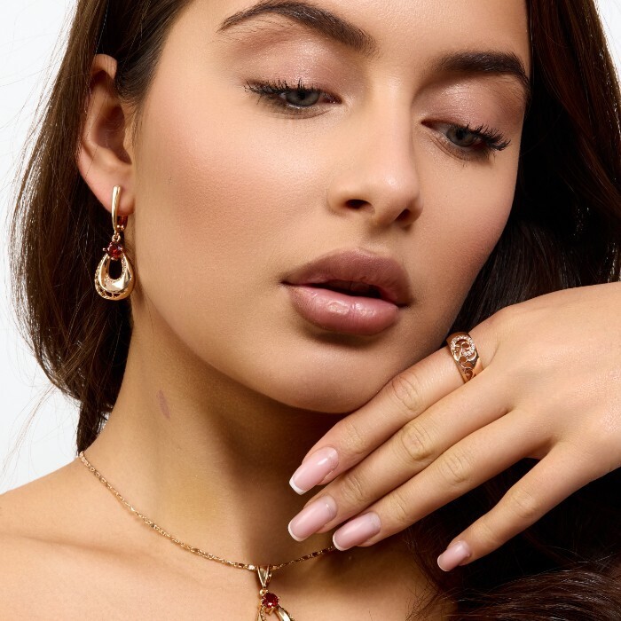 Комплект ювелирной бижутерии коллекция "Дубай" серьги, кулон и кольцо 19 р, покрытие позолота, вставка: фианиты и цирконы, цвет: кирпично-красный и прозрачный, арт.217.481-19