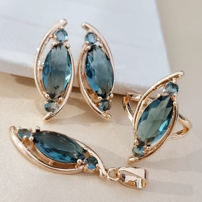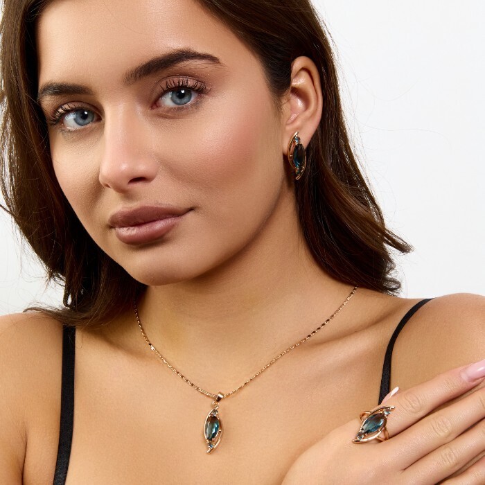 Комплект ювелирной бижутерии коллекция "Дубай" серьги, кулон и кольцо 19 р, покрытие позолота, вставка: стекло, цвет: синий, арт.414.295-19