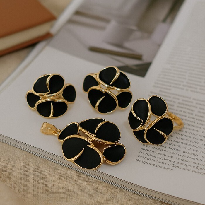 Комплект ювелирной бижутерии коллекция "Дубай" серьги, кулон и кольцо 20 р, покрытие позолота, вставка: эмаль, цвет: черный матовый, арт.313.345-20