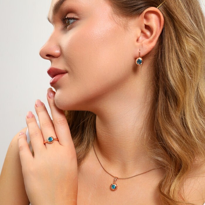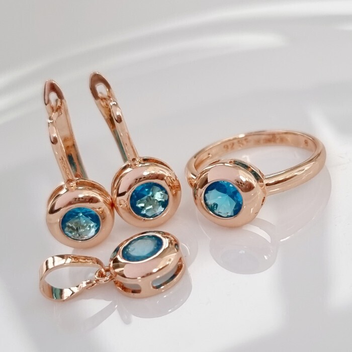 Комплект ювелирной бижутерии коллекция "Дубай" серьги, кулон и кольцо 20 р, покрытие: позолота, вставка: фианиты, цвет: голубой, арт.213.905-20
